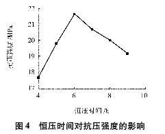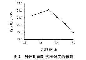 為了考查 加氣混凝土砌塊設備升壓速度對赤鐵礦尾礦蒸壓磚強度的影響,壓制成型的磚坯在蒸壓釜中勻速升壓至1.2MPa,再恒壓6h,勻速降壓3.5h,得到不同的蒸壓磚,其抗壓強度與升壓時(shí)間的關(guān)系見(jiàn)圖2。