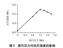 蒸汽壓力決定著(zhù)制品的水化產(chǎn)物的類(lèi)型,對制品強度的形成起著(zhù)至關(guān)重要的作用。一般來(lái)說(shuō),對于CaO -SiO -H2O系統,當蒸汽壓力達到0.8MPa時(shí),水化反應才開(kāi)始有效進(jìn)行,故試驗采用的蒸汽壓力均大于0.8MPa 。