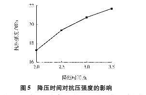 為了考查降壓時(shí)間對赤鐵礦尾礦蒸壓磚強度的影響, 加氣混凝土砌塊設備壓制成型的磚坯在蒸壓釜中經(jīng)2.lh升壓至1.2MPa ,恒壓6h后再勻速降壓,得到不同的蒸壓磚,其抗壓強度與降壓時(shí)間的關(guān)系見(jiàn)圖5。